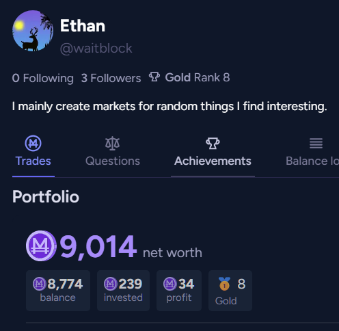 Will check the net worth on my profile when I close this market. (So it will be my net worth before this market is closed.) If it is >9,000, then this resolves YES.